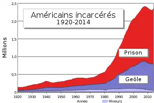 Depuis au moins les années 2000, les États-Unis ont le taux d'incarcération le plus élevé du monde ; en valeur absolue, ce pays compte plus de prisonniers que la Chine (environ 1,7 million de détenus), au Brésil (environ 750 000) ou en Russie (environ 470 000)[6]. En 2017, les États-Unis comptent 25 % des prisonniers de la planète pour une population représentant 5 % de la population mondiale.