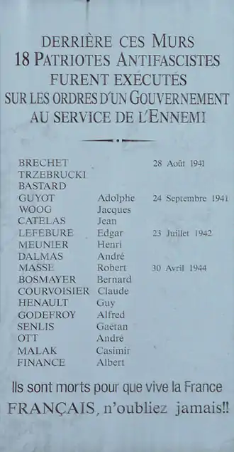 Pendant l'Occupation, outre des criminels de droit commun, on y pratiqua également les exécutions de dix-huit résistants et communistes. Neuf d'entre eux, exécutés entre et , furent guillotinés. Les neuf autres furent fusillés le . Une plaque commémorative, apposée sur le mur de la prison à l'angle des rues Jean-Dolent et de la Santé, rappelle leur fin tragique.