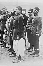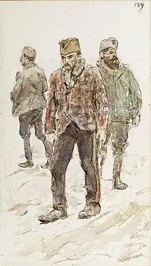 Dès 1914, des civils des zones occupées sont forcés à travailler, très souvent dans des travaux en relation avec l’effort de guerre[90] comme la reconstruction d’infrastructures détruites lors des combats (routes, voies de chemin de fer, etc.). Les plus de quatorze ans sont mis au travail[91]. Très vite, les civils sont déportés dans des camps de travaux forcés. Ils forment alors les Zivilarbeiter-Bataillone (bataillons de travailleurs civils) et portent un signe distinctif : un brassard rouge. Annette Becker indique que leurs conditions de vie sont semblables à celles des prisonniers, c’est-à-dire très dures. Les femmes sont également déportées. Les otages sont envoyés dans des camps en Prusse ou en Lituanie[92],[93]. Certains sont restés prisonniers jusqu’en 1918[94].