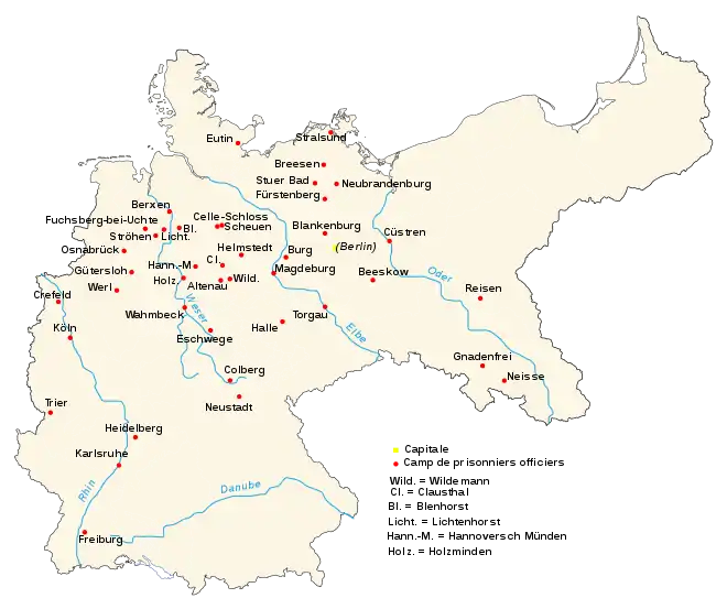 À partir de 1915, les officiers prisonniers disposent de camps qui leur sont réservés, les conditions de vie y sont souvent moins difficiles que celles que subissent les hommes de troupe. Les officiers disposent de lits au lieu de sacs de paille. Des salles spécifiques sont même aménagées pour les repas. Dispensés de travailler, les officiers jouissent d'un quotidien surtout fait d’études ou de sport. En , le nombre des camps d’officiers s’élève à soixante-treize[12]. Par ailleurs, il n’y a pas de camp important d’officiers en Prusse-Orientale (voir carte), où les conditions climatiques sont souvent plus rudes que dans le reste de l’Allemagne.