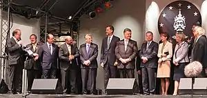 Martin Schulz après le prix Charlemagne 2015 sur la scène de Katschhof. De gauche à droite : Bernd Büttgens, Armin Laschet, François Hollande, Martin Schulz, Joachim Gauck, le roi Philippe VI, Petro Porochenko, Sauli Niinistö, Simonetta Sommaruga, Hannelore Kraft, Jürgen Linden.
