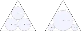 La différence d'aire pour le triangle équilatéral est petite, un peu plus de 1% (figure de gauche)[4], mais pour un triangle isocèle avec un petit angle au sommet (voir ci-dessous), les disques optimaux (empilés les uns sur les autres au-dessus de la base du triangle) ont une aire égale à près de deux fois celle des cercles de Malfatti.