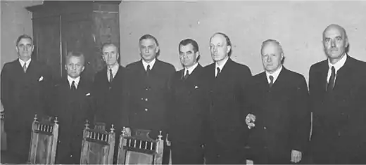 ![]() Les condamnés du procès : Henrik Ramsay, Tyko Reinikka, Antti Kukkonen, Edwin Linkomies, J. W. Rangell, Risto Ryti, Väinö Tanner et T. M. Kivimäki au Palais des États. | ||