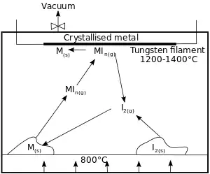 Le zirconium à purifier est chauffé sous vide dans un creuset à 50-250 °C (800 °C pour le titane) en présence d'iode. Un iodure de zirconium ou de titane (ZrI4 ou TiI4) se forme et volatilise le métal, laissant un résidu d'impuretés. À la pression atmosphérique, le TiI4 fond à 150 °C et bout à 377 °C, et le ZrI4 fond à 499 °C et bout à 600 °C. Les températures d'ébullition sont plus faibles à pression réduite.