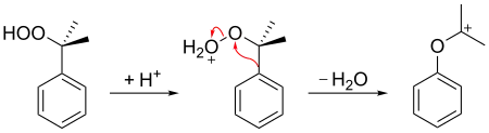 Le carbocation qui en résulte est ensuite attaqué par l'eau, puis un proton est transféré de l'atome d'oxygène du groupe hydroxyle vers l'atome d'oxygène du groupe éther, et enfin l'ion est clivé en phénol et acétone :
