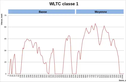 Le cycle de conduite pour la classe 1 comporte trois parties : basse, moyenne et à nouveau basse vitesse ; si Vmax < 70 km/h, la partie vitesse moyenne est remplacée par la partie basse vitesse.[31]