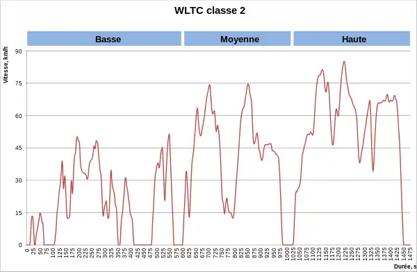 Le cycle de conduite pour la classe 2 comporte trois parties : basse, moyenne et haute vitesse ; si Vmax < 90 km/h, la partie haute vitesse est remplacée par la partie basse vitesse.[31]