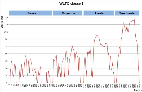 Le cycle de conduite pour la classe 3 comporte quatre phases : basse, moyenne, haute et extra haute vitesse ; si Vmax < 135 km/h, la partie très haute vitesse est remplacée par la partie basse vitesse[31].