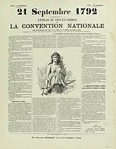 La Première République est donc née de facto par l'abolition de la monarchie, bien qu'elle n'ait jamais fait l'objet d'une proclamation officielle par un quelconque texte. Seule la décision de la Convention de dater les actes officiels non de l'an IV de la Liberté mais de l'an I de la République la mentionne pour la première fois, ouvrant l'ère républicaine.