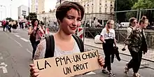 L'assistance médicale à la procréation (AMP) est encadrée en France par la loi de bioéthique du [18]. Elle est ouverte à toutes les femmes, en couple ou non, mais exclut les hommes trans[19].