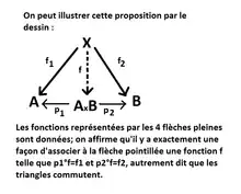 Se donner une application d'un ensemble dans le produit cartésien de deux ensembles et revient à se donner deux applications : l'une de dans et l'autre de dans . Plus formellement : l'ensemble , muni des deux projections et , est caractérisé à un isomorphisme canonique près[2],[3] par la propriété universelle suivante : pour tout ensemble et toutes applications et , il existe une unique application telle que et [4]. On résume cette propriété universelle en disant que est le produit de et dans la catégorie des ensembles.