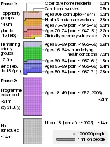 La vaccination de masse se déroule en plusieurs phases. La première cible les personnes les plus vulnérables selon leur âge. Le , le plan initial est modifié. Au lieu d'injecter deux doses à l'intervalle recommandé, le plan prévoit injecter une première dose au plus grand nombre possible de personnes puis la seconde dose 12 semaines plus tard. Au 29 décembre 2020, 698 sites étaient en opération en Angleterre.