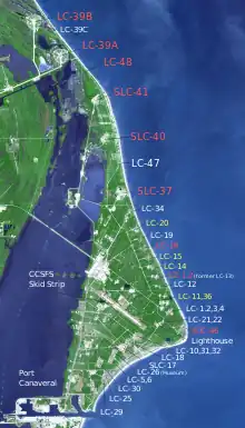 Photo aérienne du centre spatial Kennedy avec ses pas de tir. Le plus grand port spatial des Amériques.