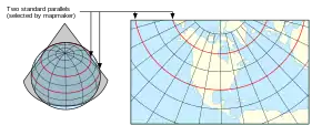 Comme pour les projections cylindriques, on distingue les projections coniques tangentes, où la déformation est minimale sur un parallèle et les projections coniques sécantes quand les déformations sont minimales autour de deux parallèles[10].