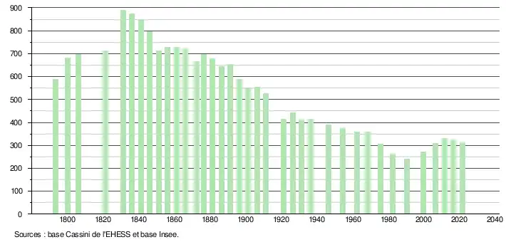 L'évolution du nombre d'habitants est connue à travers les recensements de la population effectués dans la commune depuis 1793. Pour les communes de moins de 10 000 habitants, une enquête de recensement portant sur toute la population est réalisée tous les cinq ans, les populations légales des années intermédiaires étant quant à elles estimées par interpolation ou extrapolation[51]. Pour la commune, le premier recensement exhaustif entrant dans le cadre du nouveau dispositif a été réalisé en 2006[52].