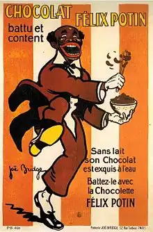 Les affiches de propagande coloniale ont tout de même une spécificité dans la première moitié du XXe siècle : elles optent toutes pour une vision dominatrice de ces territoires et populations d'outre-mer. C'est un véritable racisme colonial qui apparaît notamment sur les affiches publicitaires[19]. L'image est le support principal de mise en scène de l’indigène auprès de la population française[28]. Cette infériorisation des colonisés, liée aux différentes études scientifiques préconisant une « hiérarchie des races », se retrouve dans l'imagerie coloniale[29]. C’est la représentation de l'indigène sauvage qui apparaît au début du XXe siècle. Cet indigène sauvage est un être, situé entre humanité et animalité, qu'il convient de civiliser. C'est d'ailleurs l'objectif de cette mission civilisatrice tant louée par la métropole française[30]. Dans les années 1930, l'image de l’indigène type montre les effets de cette mission éducative sur les populations colonisées.