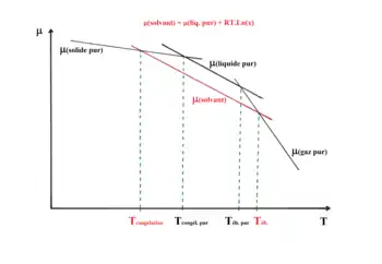 Lorsqu'un solvant pur liquide est en équilibre avec une autre phase (solvant pur gazeux ou solide) sous la pression et à la température , les potentiels chimiques de ce corps dans les deux phases sont égaux :