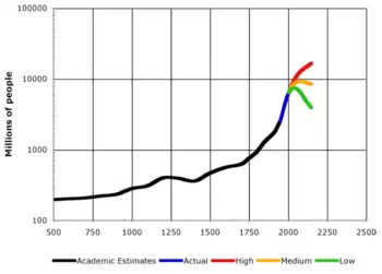 Comme de nombreux démographes dans le monde, l'ONU a d'abord supposé dans les années 1990/2000[6], et alors que le cap des 6 milliards de terriens était atteint vers 1999[7] que la population pourrait se stabiliser à la fin du XXIe siècle vers 9 milliards d'êtres humains. Finalement, le Département des affaires économiques et sociales de l'ONU a fortement révisé (à la hausse) en 2011 ses hypothèses et conclusions en termes de projection démographique (2010 Revision of World Population Prospects)[5]. Cela est dû à plusieurs points :