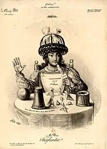 Caricature d’Enfantin par Delaporte pour La Galerie des fous contemporains dans le no 8 de la Charge : « le Père Fanfantin » y est représenté, à Sainte-Pélagie, tenant la Morale en hochet.