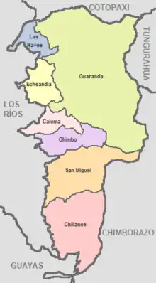 Cette province est située au centre-ouest de l'Équateur. Elle couvre une superficie de 3 945 km2[2]. Elle est délimitée au nord par la province de Cotopaxi, à l'est par les provinces de Tungurahua et du Chimborazo, au sud par la province de Guayas et à l'ouest par la province de Los Ríos. Sa capitale est Guaranda.
