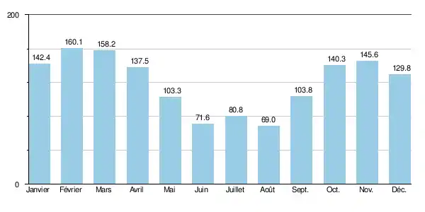 | Précipitations (mm) | 142,4 | 160,1 | 158,2 | 137,5 | 103,3 | 71,6 | 80,8 | 69 | 103,8 | 140,3 | 145,6 | 129,8 | 1 442,4 |