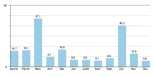 | Précipitations (mm) | 15,7 | 16,1 | 47,1 | 9,7 | 16,9 | 6,8 | 6,9 | 6,1 | 8,4 | 40,3 | 12,9 | 5,8 | 189,9 |