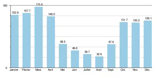 | Précipitations (mm) | 152,9 | 157,7 | 175,6 | 148 | 68,5 | 49,6 | 39,7 | 32,9 | 67,9 | 131,7 | 130,2 | 136,1 | 1 290,8 |