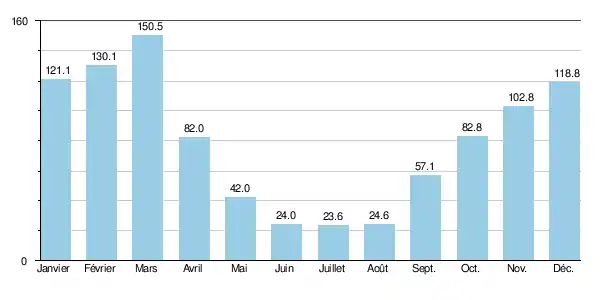 | Précipitations (mm) | 121,1 | 130,1 | 150,5 | 82 | 42 | 24 | 23,6 | 24,6 | 57,1 | 82,8 | 102,8 | 118,8 | 959,4 |