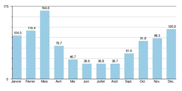 | Précipitations (mm) | 104,5 | 116,4 | 164,6 | 79,7 | 46,7 | 36,6 | 36,8 | 36,7 | 61,6 | 91,8 | 98,3 | 120 | 993,7 |