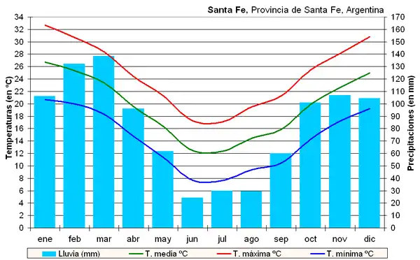 La température moyenne de la ville de Santa Fe, atteint 18,5 °C, ce qui est vraiment beaucoup plus chaud que les 10,8 °C de Paris, 10,5 °C de Genève, 10,4 °C de Bruxelles, soient des températures beaucoup plus basses. On voit ainsi que la ville et sa région bénéficient d'un climat subtropical chaud. En réalité le climat de la ville soutient largement la comparaison avec la ville française de Nice (moyenne annuelle de 16,0 °C) ou italienne de Rome (15,5 °C).