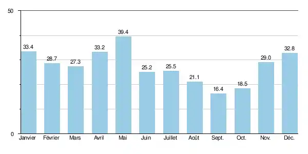 Précipitations (mm) 33,4 28,7 27,3 33,2 39,4 25,2 25,5 21,1 16,4 18,5 29 32,8 330,5