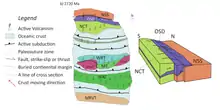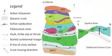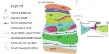 - Arc volcanique cadrant à l'ouest[31],[32],[33] - Marge continentale cadrant dans l'est |