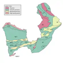 - Nord : Roches volcaniques liées à des intrusions stratifiées[2],[44] - Centre : Roches plutoniques et roches volcaniques mineures[45] - Sud : Jeunes grauwackes, congloméerat et roches alkalines volcaniques[46] |