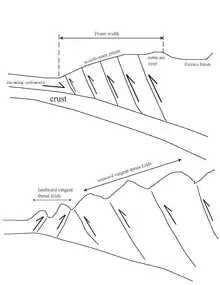 Certains terranes, comme le Pontiac Terrane, étaient auparavant une ceinture de plissement-chevauchement, c'est-à-dire, une zone constituée d'une série de chevauchements (failles inverses) et de plis de faille séparés par des failles principales. La ceinture de poussée pliée se forme avec de la compression comme celle de la collision avec la croûte. Lorsque celle-ci est comprimée, les poussées prennent pour origine, la provenance de la compression. Les murs suspendus des poussées glissent le long du plan de faille et s'empilent au-dessus du mur, formant une rampe anticlinale ou un pli de faille[13].