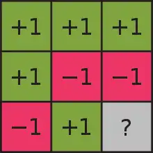 En effet, s'il n'est pas possible de construire un tableau 3 × 3 avec des entrées +1 et -1 telles que le produit des éléments de chaque ligne est égal à +1 et le produit des éléments de chaque colonne est égal à -1, il est possible de le faire avec la structure algébrique plus riche basée sur des matrices de spin.