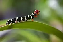 La chenille est de grande taille, à rayures de couleur jaune et noire et à tête rouge-orange. Sur l'arrière du corps, elle possède un filament qui oscille dans un mouvement de va-et-vient lors de sa marche.