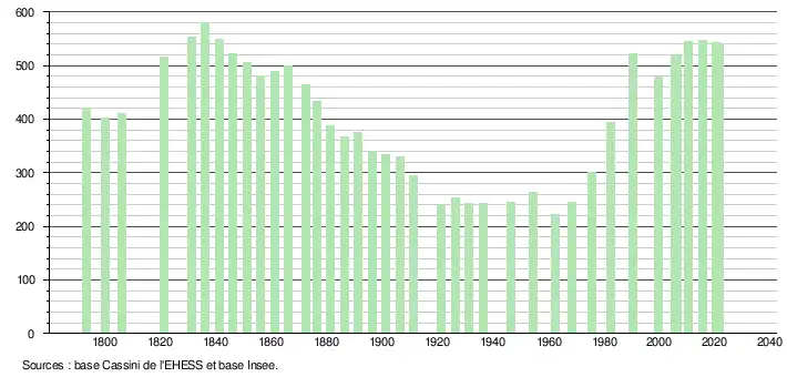 L'évolution du nombre d'habitants est connue à travers les recensements de la population effectués dans la commune depuis 1793. Pour les communes de moins de 10 000 habitants, une enquête de recensement portant sur toute la population est réalisée tous les cinq ans, les populations légales des années intermédiaires étant quant à elles estimées par interpolation ou extrapolation[21]. Pour la commune, le premier recensement exhaustif entrant dans le cadre du nouveau dispositif a été réalisé en 2005[22].