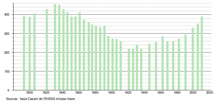 L'évolution du nombre d'habitants est connue à travers les recensements de la population effectués dans la commune depuis 1793. À partir du , les populations légales des communes sont publiées annuellement dans le cadre d'un recensement qui repose désormais sur une collecte d'information annuelle, concernant successivement tous les territoires communaux au cours d'une période de cinq ans. Pour les communes de moins de 10 000 habitants, une enquête de recensement portant sur toute la population est réalisée tous les cinq ans, les populations légales des années intermédiaires étant quant à elles estimées par interpolation ou extrapolation[6]. Pour la commune, le premier recensement exhaustif entrant dans le cadre du nouveau dispositif a été réalisé en 2005[7],[Note 2].