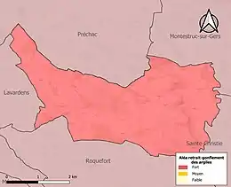 Le retrait-gonflement des sols argileux est susceptible d'engendrer des dommages importants aux bâtiments en cas d’alternance de périodes de sécheresse et de pluie. La totalité de la commune est en aléa moyen ou fort (94,5 % au niveau départemental et 48,5 % au niveau national). Sur les 44 bâtiments dénombrés sur la commune en 2019, 44 sont en aléa moyen ou fort, soit 100 %, à comparer aux 93 % au niveau départemental et 54 % au niveau national. Une cartographie de l'exposition du territoire national au retrait gonflement des sols argileux est disponible sur le site du BRGM[23],[Carte 3].