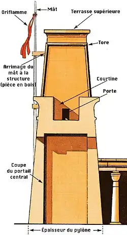 Un pylône (terme issu du grec πυλών, « pulon », signifiant portail) est une construction monumentale formée de deux tours à base rectangulaire reliées par un linteau, offrant une porte d’entrée dans les temples égyptiens. À l'extérieur, des renfoncements permettaient de planter d’immenses mâts à l’extrémité desquels flottaient des oriflammes, annonçant de loin la présence de la maison divine.