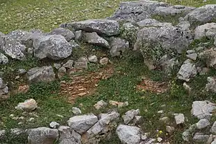 Au sud de l'entrée, un bassin profond, alimenté par une conduite d'eau, s'écoulait vers le sud-ouest sur le sol en ciment qui s'inclinait à l'ouest en un creux peu profond. De là, l'eau était dirigée vers l'extérieur à travers le mur sud. Dans la zone est, au sud de l'entrée, se trouvait un puits. Les parties inférieures de pithoi (jarres) ont été trouvées dans la zone ouest. On n'a trouvé aucune autre sépulture qu'une tombe récente contenant un fer à cheval de facture moderne[4].