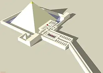 L'autre des particularités de ce temple réside donc dans son plan. En effet, la chaussée débouche bien sur la partie d'accueil et la cour péristyle mais ces éléments sont placés au sud de l'axe principal de la pyramide. Ce fait est diversement interprété.