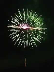 - production de lumière (ex : feux d'artifice) : Les couleurs perceptibles par l’œil vont d’une longueur d'onde comprise entre 380 nm (violet) et 780 nm (rouge). C’est l’addition, dans le mélange pyrotechnique de composés métalliques, qui permet la création d’effets lumineux. (rouge : strontium, violet : potassium, bleu : cuivre ou zinc, vert : baryum, jaune : sodium, blanc : magnésium ou aluminium, argent : titane)[5]. En pyrotechnie, les phénomènes entraînant la diffusion de lumière colorée sont l'incandescence, l'émission atomique et l'émission moléculaire ;