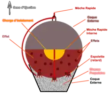 - après l'allumage de la mèche, celle-ci allume la chasse tout en allumant la bombette qui propulse l'artifice hors du tube ;