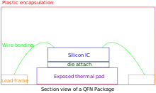 La figure montre la section transversale d'un boîtier QFN avec grille de connexion et câblage. Il existe deux types de conception du boîtier, la séparation par poinçonnage et la séparation par sciage[3]. La séparation par scie découpe un grand ensemble de boîtiers en plusieurs parties. Dans le cas du poinçonnage, un seul boîtier est mis en forme à l'aide d'un moule.