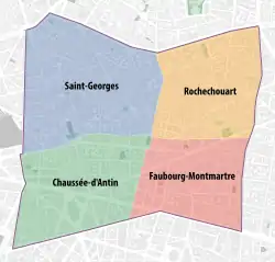 Il est traversé par la rue de Clichy, la rue Blanche, la rue Jean-Baptiste-Pigalle, la rue Catherine-de-La-Rochefoucauld, la rue Notre-Dame-de-Lorette, la rue de Douai, la rue Victor-Massé, la rue de Bruxelles, la rue de Vintimille, la rue Ballu, la rue Chaptal, la rue du Cardinal-Mercier, la cité Monthiers, la rue de Parme, la rue de Liège, la rue de Milan, la rue d'Athènes, la rue de Londres, la rue de Budapest, la rue de la Tour-des-Dames, la rue Taitbout, la rue Pierre-Fontaine, la rue Frochot, la rue Moncey, la rue La Bruyère, la rue de Navarin, la rue d'Aumale, la rue Henry-Monnier, la rue Clauzel, la rue Laferrière.