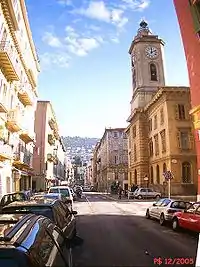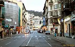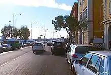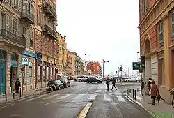 ![]() La rue de Foresta longe le port, ici dans le sens S → N. À gauche, les rares immeubles qui occupent les flancs de la colline du Château, côté port. |