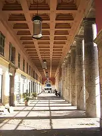 ![]() Portique avec son plafond à caisson de la place Île-de-Beauté, côté est et rue Arson. |
