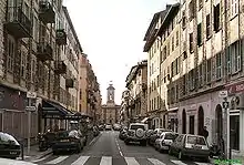 ![]() La rue Bonaparte avant son débouché sur la place Garibaldi, au fond. L'auberge où séjourna Bonaparte se situe à gauche. |