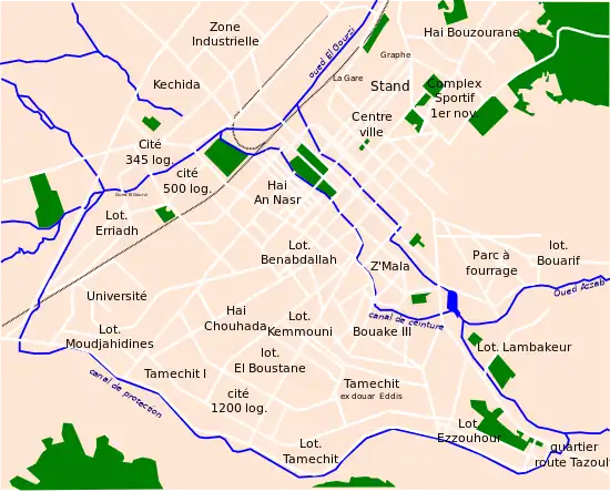Située dans la partie nord-ouest en périphérie de la ville dans une cuvette et juxtaposée à l’oued El Gourzi, constituée de deux parties ZI1 et la ZI2. ZI1 est créé en 1972 et comporte une usine de textile, une briqueterie et une tannerie. ZI2 a été construite sur 147 ha en 1976, elle comporte plusieurs unités de fabrications et de services[3]